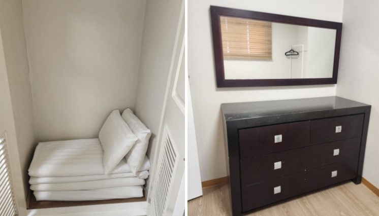 침대방 한쪽에는 이불장과 화장대가 놓여 있었는데요, 오래된 느낌의 화장대였지만 짐을 올려놓기에는 충분한 공간이었습니다.