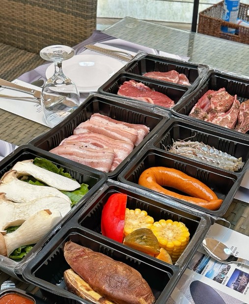저희는 쉘터에 도착한 후 얼마 지나지 않아, 직원분이 BBQ 박스를 쉘터 앞으로 가져다주셨습니다. 이 박스에는 다양한 고기와 해산물, 채소 등 바베큐에 필요한 모든 재료들이 담겨있습니다.