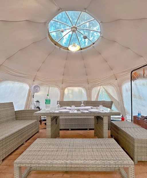 쉘터 안에는 바베큐를 즐기기 위한 식기류, 와인잔, 선풍기, 커피포트, 랜턴 등 필요한 물품들이 모두 갖춰져 있었습니다. 또한 생수, 전기방석, 담요도 준비되어 있어, 날씨에 구애받지 않고 편안하게 머무를 수 있었어요.