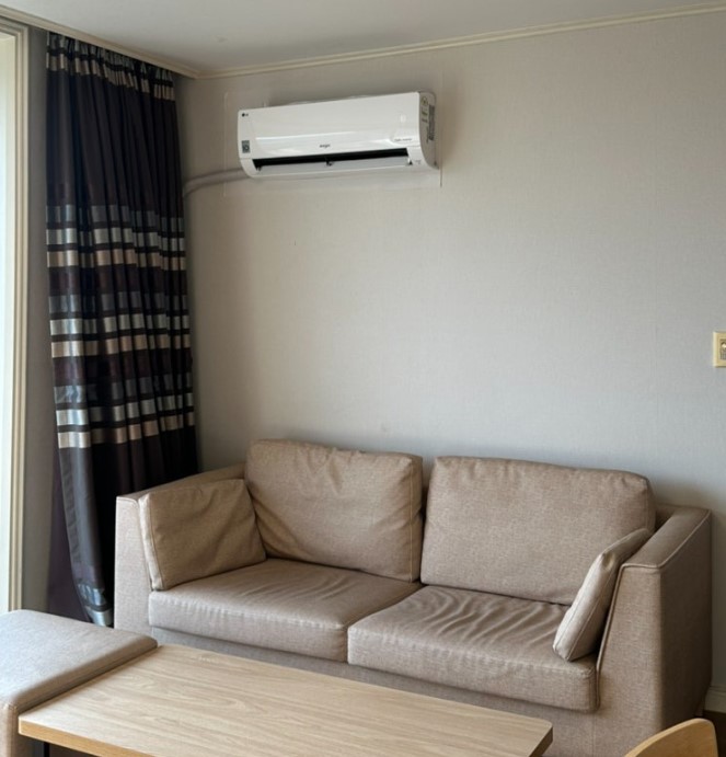 거실에는 소파와 작은 TV가 비치되어 있었습니다. TV가 조금 작아서 아쉬운 점이 있었지만, 큰 불편함은 없었어요. 거실에는 에어컨이 설치되어 있어 시원하고 쾌적하게 지낼 수 있었습니다.