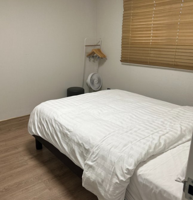 침대방에는 선풍기가 구비되어 있었고, 거실보다는 다소 답답한 느낌이 있었지만, 선풍기를 활용해서 시원하게 지낼 수 있었습니다. 침대는 2인이 사용하기에 적당한 크기였지만, 개인적으로는 조금 불편하다는 느낌이 있었습니다. 다만, 전체적으로는 깨끗하게 정돈된 상태라 편안하게 머물 수 있었습니다.