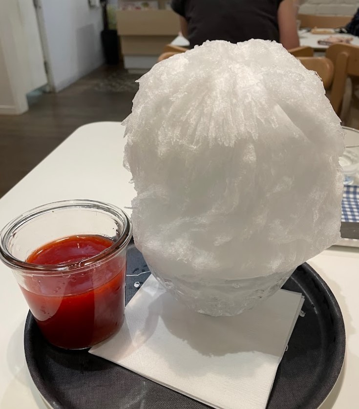계속 걷다가 빙수를 파는 카페에 들어갔어요. 일본의 더운 날씨에는 빙수만큼 시원한 간식이 없죠. 간 얼음 위에 딸기 시럽을 뿌린 빙수는 정말 간단하지만 그 맛이 일품이었어요.