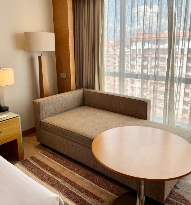 객실 한쪽에 있는 소파와 테이블은 여행 중 피곤할 때 잠시 쉬거나 간식을 즐기기에 아주 유용했습니다. 코타키나발루에서는 다양한 로컬 음식을 맛보게 되는데, 이 공간 덕분에 호텔에서도 편안하게 음식과 간식을 즐길 수 있었습니다.