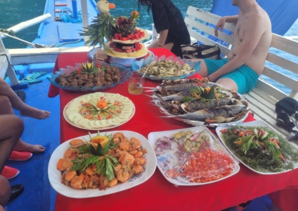 투어 중 점심은 호핑투어에 포함된 식사로 제공되었는데, 맑고 푸른 바다 위에서 맛있는 식사를 즐기는 시간은 정말 특별했어요. 바다 위의 맛집에서 제공된 현지 음식들은 수영으로 지친 몸에 에너지를 가득 채워주는 느낌이었어요. 주로 신선한 해산물과 다양한 현지식 메뉴들이 준비되어 있어, 팔라완만의 색다른 미식을 경험할 수 있었답니다.