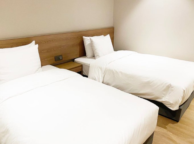 다른 한 쪽 침실은 싱글베드 두 개가 놓여 있는 방으로, 이곳은 에어컨과 창문이 없어 약간 답답하게 느껴질 수 있습니다. 하지만 조용하고 아늑한 공간이라 잠을 자기에는 충분히 편안합니다. 각 방마다 옷장이 있어, 여행 중 가져온 옷과 짐을 정리하기에도 매우 편리합니다.