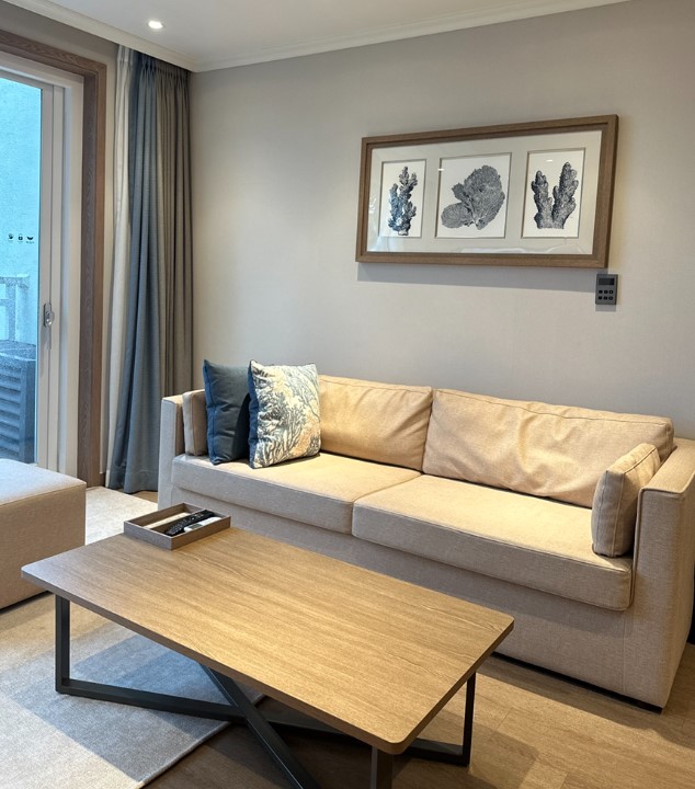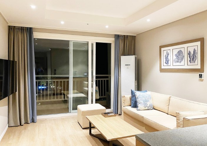 켄싱턴리조트 서귀포점의 리뉴얼 객실에 들어서면 가장 먼저 눈에 띄는 것은 널찍한 거실입니다. 거실에는 편안한 소파와 TV가 준비되어 있어, 하루 종일 제주도를 탐험한 후 휴식을 취하기에 안성맞춤입니다.