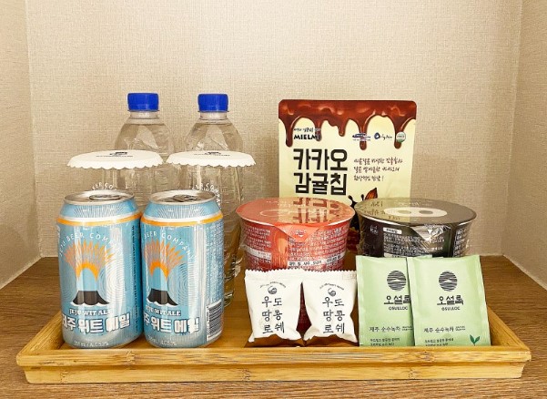 켄싱턴리조트 서귀포점에서는 고객을 위한 작은 선물로 웰컴 미니바를 무료로 제공하고 있습니다. 제주 에일 맥주 2캔, 제주 흑돼지와 딱새우 컵라면 2개, 우도 땅콩 로쉐, 2L 생수 1병 등이 포함되어 있습니다.
