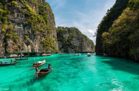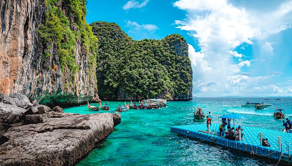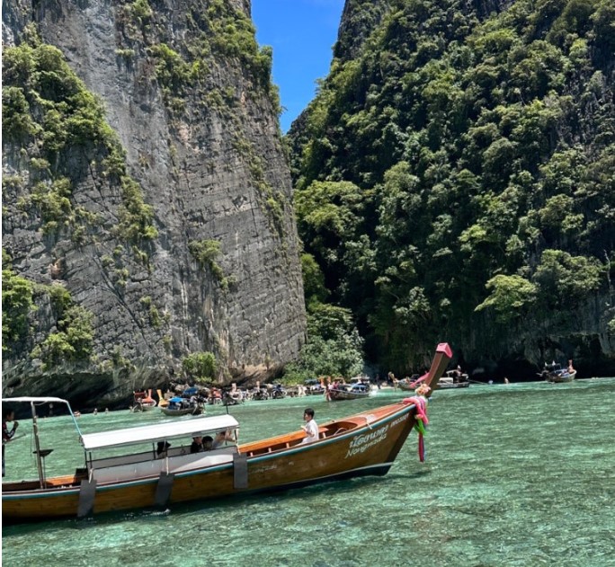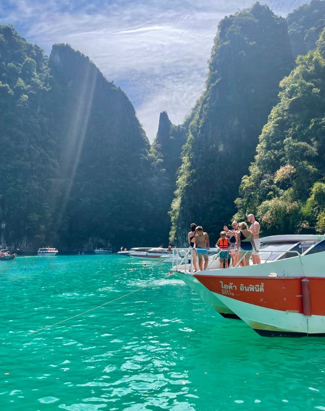 마야섬을 떠나 다음 목적지인 필레 라군으로 향했습니다. 이곳은 높은 절벽으로 둘러싸인 자연의 아름다움이 돋보이는 장소입니다.