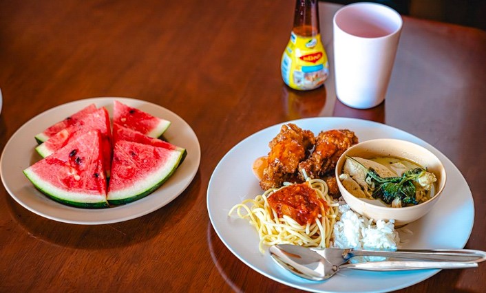 다양한 음식이 준비되어 있었고, 특히 파스타와 치킨, 수프, 신선한 수박이 인상적이었습니다. 음식의 맛도 괜찮아 여행 중 에너지를 보충하기에 충분했습니다.