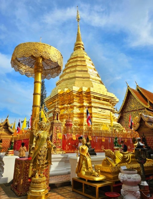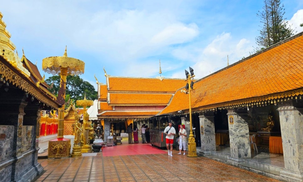 정상에 도착하면 황금빛으로 빛나는 탑과 부처상이 반겨주며, 치앙마이 전경이 한눈에 내려다보이는 전망이 장관입니다.