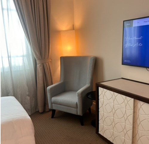 객실은 약간 아담한 크기였지만, 공간이 효율적으로 설계되어 짐을 풀거나 움직이는 데 전혀 불편함이 없었습니다. 벽에는 심플한 아트워크가 장식되어 있어 시각적으로도 편안함을 더해주었고, 창문을 통해 싱가포르의 도시 풍경을 감상할 수 있었습니다. 특히, 방음이 잘 되어 객실 내에서 휴식을 취할 때 외부 소음에 방해받지 않아 좋았습니다.