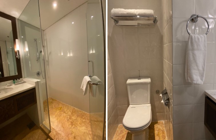 화장실은 넓지는 않지만 실용적으로 설계되어 있었습니다. 샤워 부스와 변기, 세면대가 효율적으로 배치되어 있어 사용하기 편리했습니다. 특히 샤워 부스의 수압이 강하고 물 온도 조절이 쉬워 여행 중 피로를 풀기에 좋았습니다.
