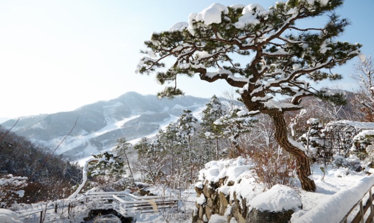 5만 평 규모의 수목원은 사계절 내내 아름다운 자연 풍경을 제공합니다. 겨울에도 설경 속에서 산책을 즐길 수 있어 자연을 만끽하고 싶은 분들에게 추천합니다.