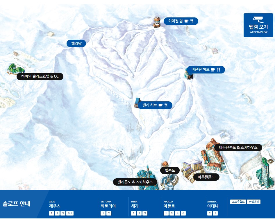 하이원 스키장은 초급자부터 상급자까지 모두를 만족시키는 18개의 슬로프를 자랑합니다. 슬로프 이름은 그리스 신화의 신들의 이름에서 따와 특별함을 더했죠.