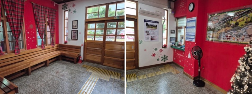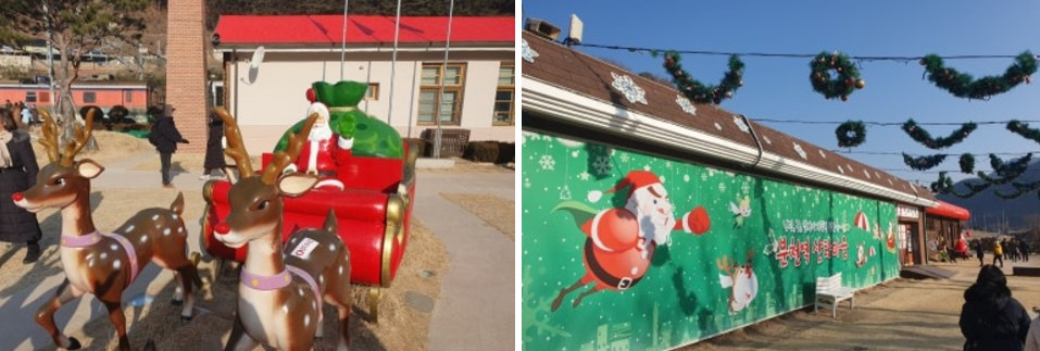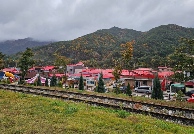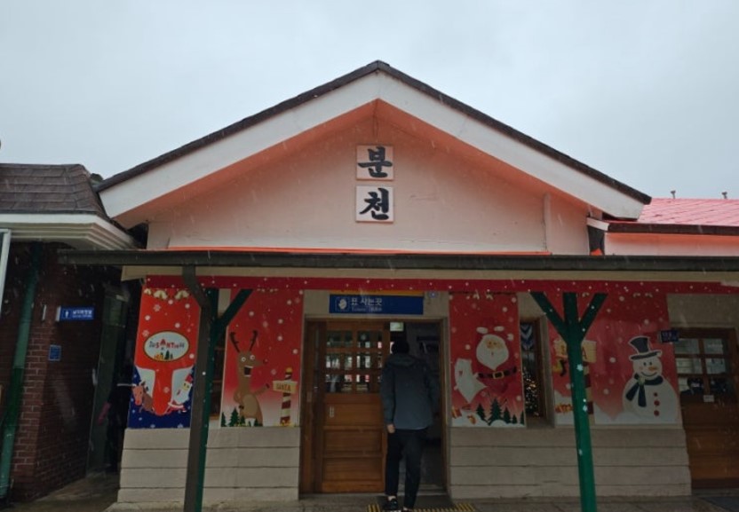 첫 번째 하이라이트는 바로 분천역입니다. 이곳은 작은 마을이지만 ‘산타마을’이라는 테마로 꾸며져 있어 동화 같은 분위기를 자아냅니다. 겨울철에 더 유명하지만 가을에도 여전히 특별한 매력을 지니고 있습니다.