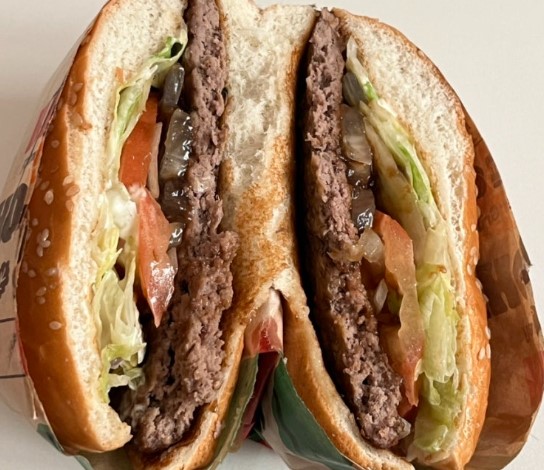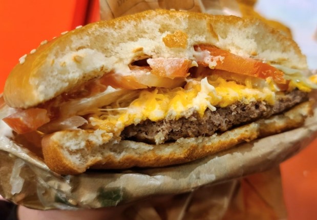 촉촉하고 두툼한 쇠고기 패티 위에 아삭한 양상추와 양파, 신선한 토마토가 더해져 풍성한 식감을 느낄 수 있습니다.