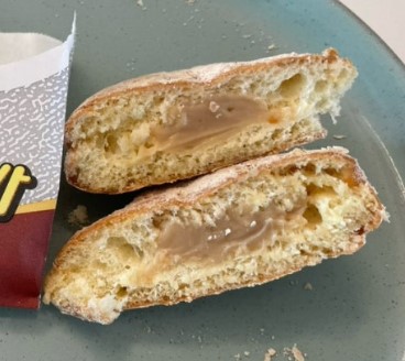 잼의 양이 과거보다 줄어 아쉽다는 분들도 계시지만, 개인적으로는 이 정도의 양이 빵과의 밸런스를 잘 맞췄다고 느꼈습니다. 우유와 함께 먹으면 더욱 잘 어울리는 도넛입니다.
