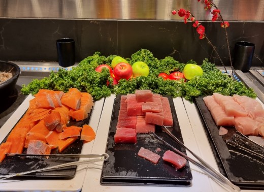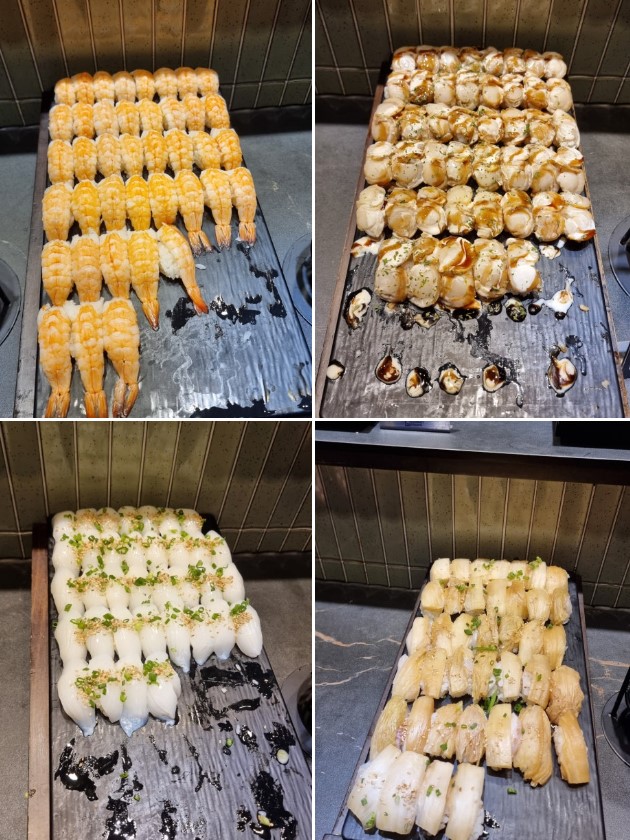 스시와 사시미 코너에서는 다양한 초밥과 롤이 준비되어 있었습니다. 간장새우초밥, 연어초밥, 참치초밥 등 신선한 재료로 만든 메뉴들은 퀄리티가 뛰어났습니다.