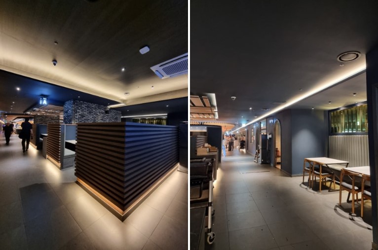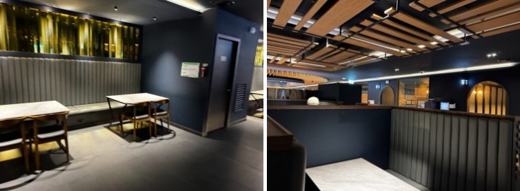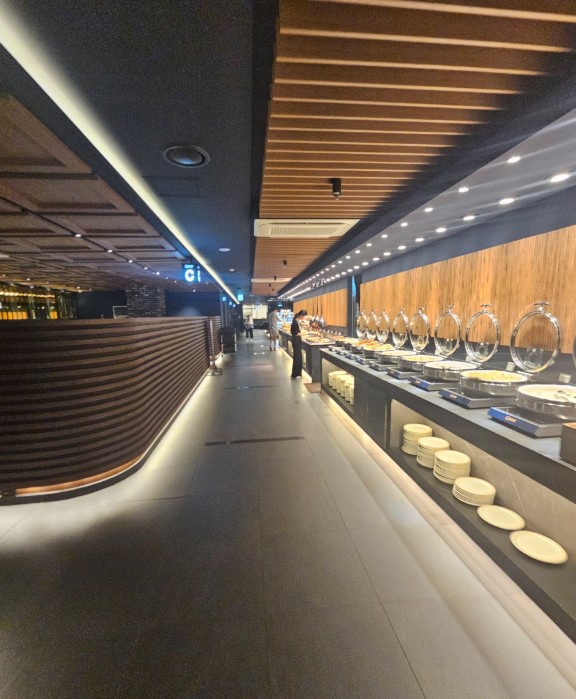 고메스퀘어의 내부는 상당히 넓은 편입니다. 각종 요리가 준비된 뷔페 섹션과 식사 공간이 양쪽으로 나뉘어 있어 원하는 음식을 골라 담기 편리했어요. 특히 단체석도 마련되어 있어 연말 송년회나 가족 모임 장소로도 제격입니다.