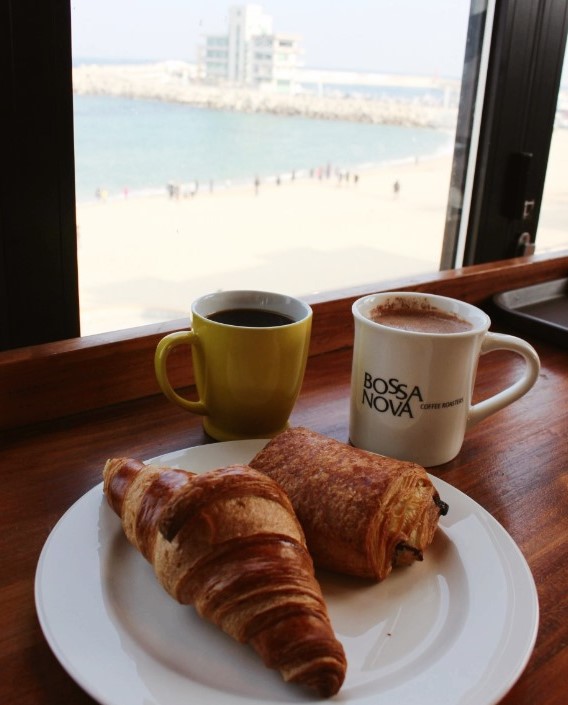 겨울바다를 배경으로 따뜻한 커피를 마실 수 있는 감성적인 공간인데요, 유리창 너머로 펼쳐진 바다와 잔잔한 파도 소리는 여행의 피로를 말끔히 씻어줍니다.