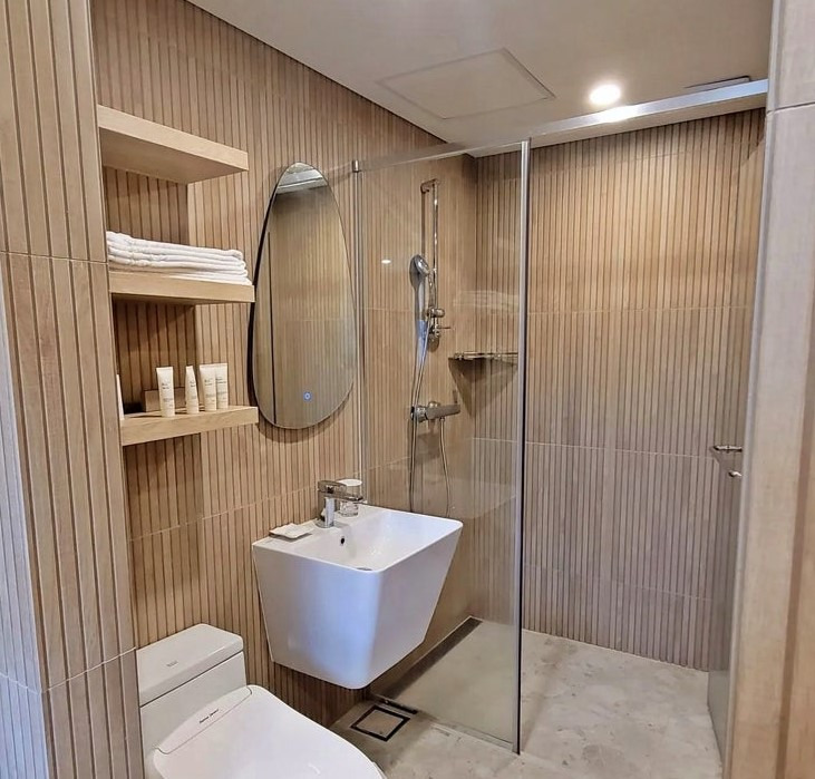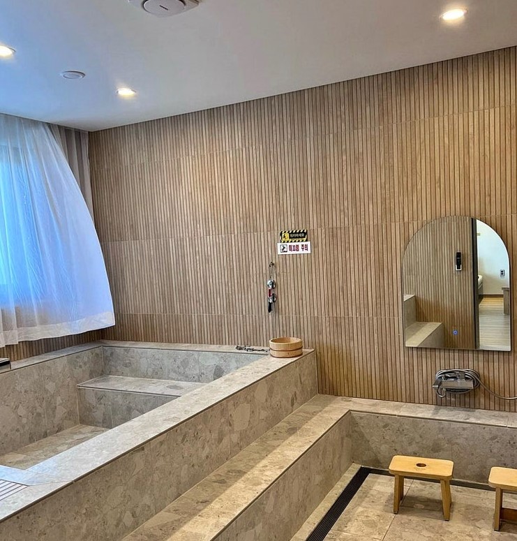 욕조는 꽤 넓고 깊어 온 가족이 함께 사용하기에 충분했으며, 계단형 디자인으로 아이들도 안전하게 이용할 수 있었습니다. 특히 탕 옆에는 앉아서 몸을 씻을 수 있는 샤워 공간이 별도로 마련되어 있어 사용이 편리했습니다.