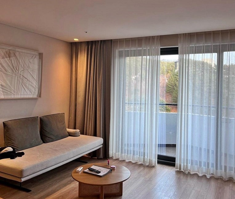 거실과 침대방은 슬라이딩 도어로 구분되어 있어, 공간 활용이 유연하며 프라이버시를 지킬 수 있는 점이 인상적이었습니다. 침대는 더블 사이즈로 넉넉했고, 침구류는 뽀송뽀송하고 깔끔하게 관리되고 있었습니다.