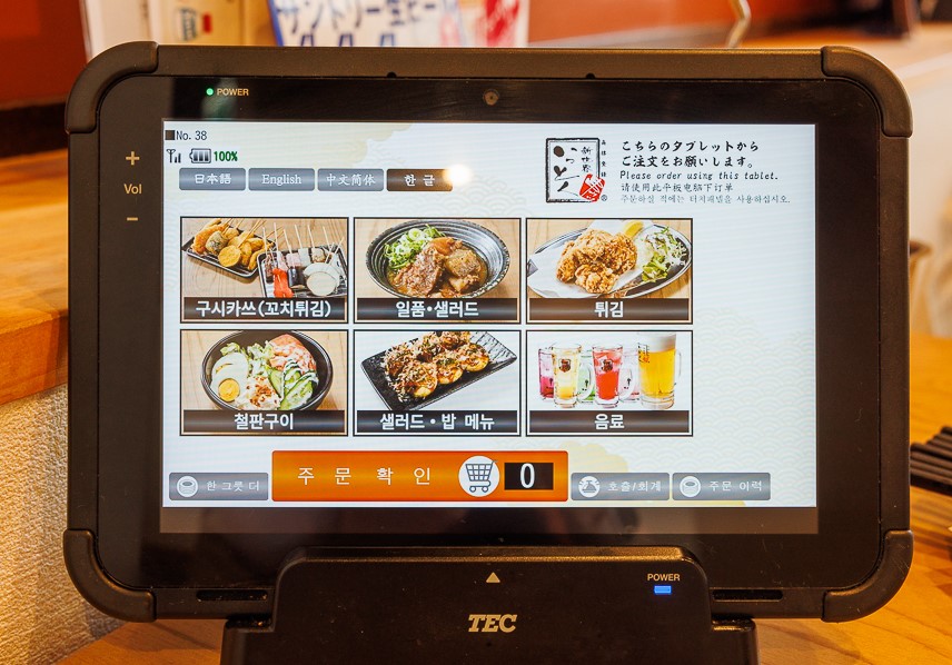 잇도쿠에서는 다양한 쿠시카츠와 함께 타코야끼, 야끼소바 등 오사카 대표 음식을 함께 즐길 수 있습니다. 메뉴판은 한국어를 지원해 주문이 편리하며, 태블릿으로 간단히 메뉴를 선택할 수 있어 여행자들에게 큰 장점으로 다가옵니다.