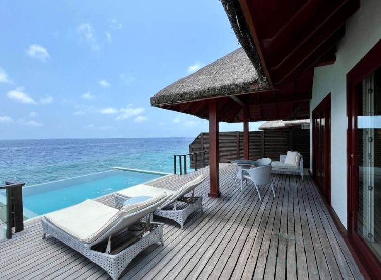 오버워터 풀빌라의 하이라이트는 바로 개인 수영장입니다. 끝없이 펼쳐진 몰디브 바다를 바라보며 즐기는 수영은 그야말로 천국 같은 경험이었습니다.