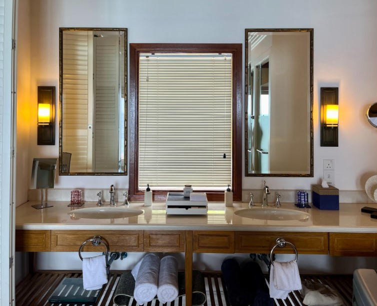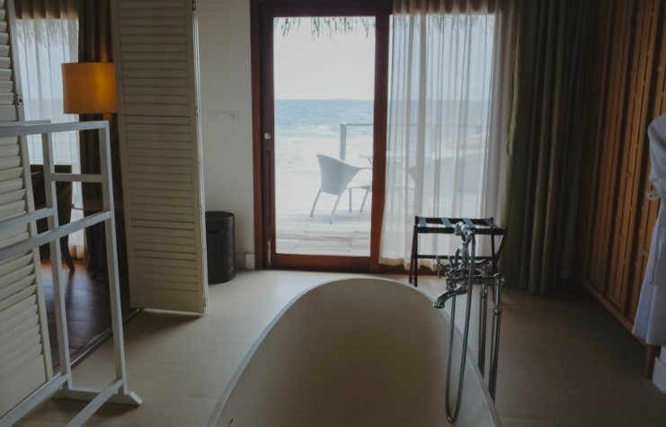 욕실은 몰디브에서의 특별한 경험을 더욱 풍부하게 만들어줍니다. 욕실에서 바다를 바라보며 샤워를 할 수 있다는 점이 가장 인상적이었는데요, 인도양을 바라보며 샤워를 하는 경험은 그 어디에서도 쉽게 누릴 수 없는 특별한 순간이었습니다. 욕조 역시 바다를 향해 있어, 목욕을 하며 여유로운 시간을 보낼 수 있습니다.