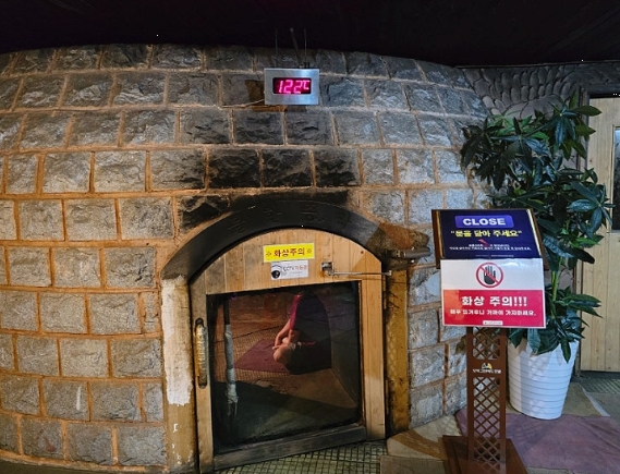 식사 후 불가마 체험도 해보았습니다. 내부 온도가 120도로 표시되어 있어 긴장했지만 생각보다 견딜 만했습니다. 약 1시간 정도 찜질을 마치고 다시 온천을 이용하러 이동하였습니다.