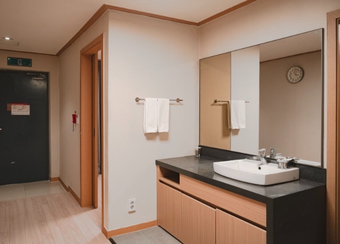 디럭스 온돌 객실의 욕실은 제게 가장 큰 만족을 준 부분이에요. 이곳의 천연 미네랄 온천수는 피부에 좋은 약알카리성으로, 샤워 후 피부가 촉촉하고 매끄럽게 느껴졌답니다.