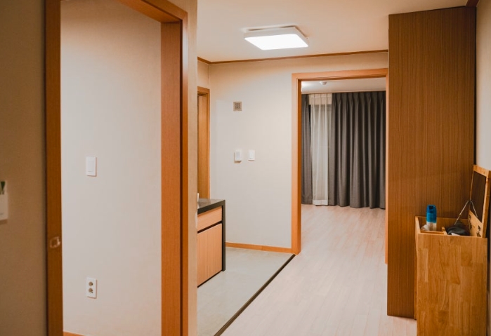 객실 구조는 거실 겸 넓은 방 1개, 작은 방 1개, 그리고 욕실 1개로 나뉘어 있어요. 여기에 에어컨, 대형 TV, 좌식 테이블 등이 마련되어 있어 가족이나 친구들끼리 함께 머무는 데에 전혀 불편함이 없었어요.
