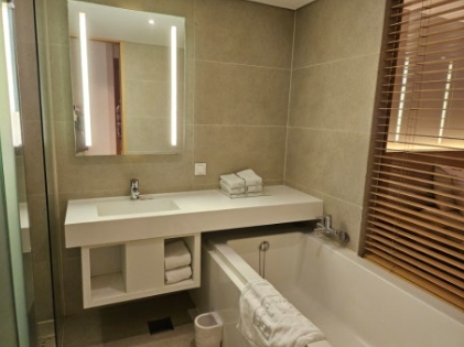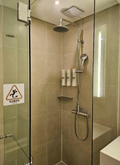 화장실은 다른 호텔들에 비해 꽤 넓고 깔끔했어요. 특히 샤워부스와 변기가 분리된 구조가 마음에 들었어요. 한 공간에 여러 가지가 혼합되지 않고, 독립된 공간으로 구분되어 있어 사용하기 훨씬 편리했죠.