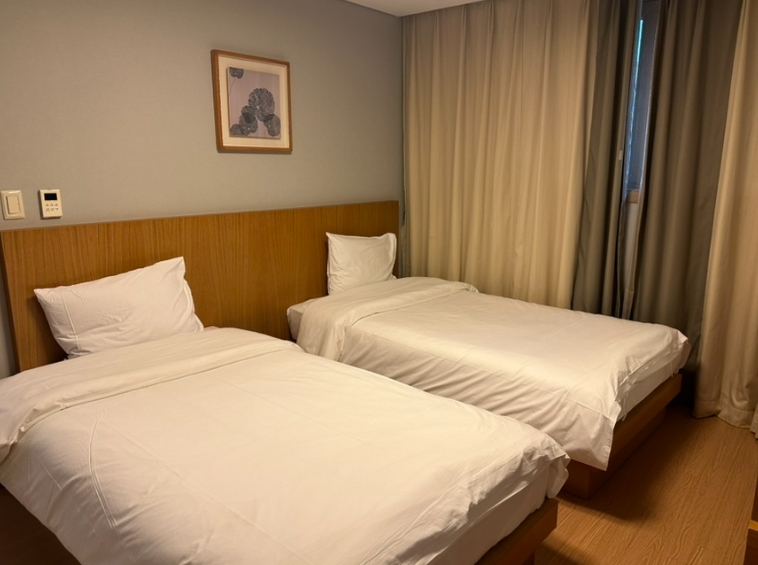 침실은 싱글 침대 2개가 배치되어 있으며, 매트리스의 푹신함이 적당해 편안하게 숙면을 취할 수 있었습니다.