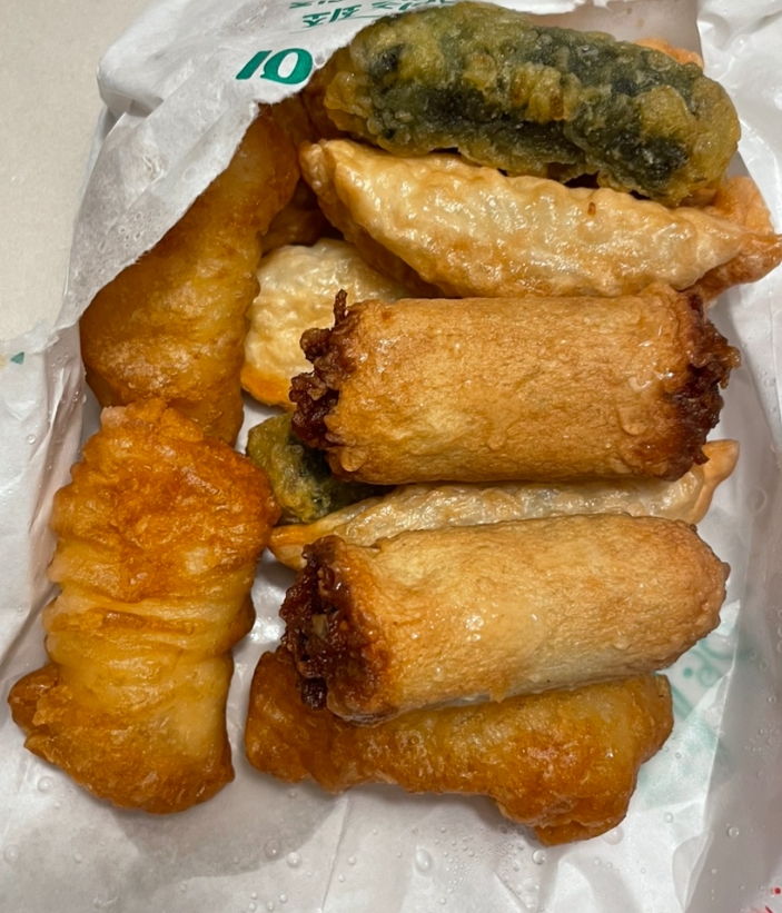 떡볶이를 먹을 때 빠질 수 없는 사이드 메뉴가 바로 튀김이죠. 신전 떡볶이의 모둠튀김은 다양한 종류의 튀김을 한 번에 즐길 수 있는 메뉴로, 가격은 4000원입니다.