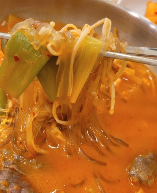 한양식육계장의 국물은 처음에는 맵고 자극적이지만, 그 후에는 국물 속에서 돼지고기와 다양한 채소가 어우러져 매운맛이 더욱 부드럽게 다가옵니다.