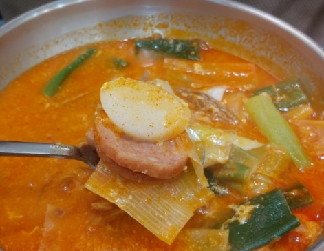 햄과 소시지가 넉넉히 들어 있어 부대찌개 특유의 짭조름한 맛이 더해지고, 소고기와 각종 채소들이 풍성하게 들어가 한 그릇만으로도 든든한 식사가 됩니다. 특히, 햄과 소시지가 국물에 잘 배어 있어 한입 베어 물면 짭조름하면서도 고소한 맛이 퍼집니다.