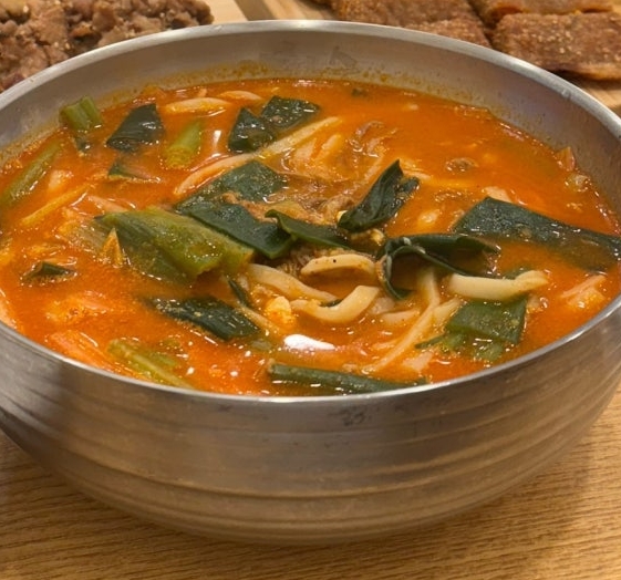 육개장 칼국수는 진한 육개장 국물에 쫄깃한 칼국수 면이 들어간 메뉴입니다. 육개장의 깊고 얼큰한 국물 맛이 면발에 스며들어 한입 먹을 때마다 감칠맛이 가득 느껴집니다.