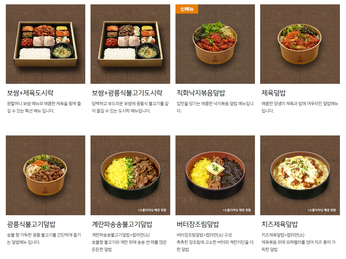 원할머니보쌈 도시락은 여러 가지 메뉴가 있어 선택의 폭이 넓습니다. 기본적으로 보쌈도시락 외에도 소갈비짐, 직화낙지볶음, 덮밥류 등 다양한 메뉴가 준비되어 있어, 각자의 취향에 맞는 음식을 고를 수 있죠.