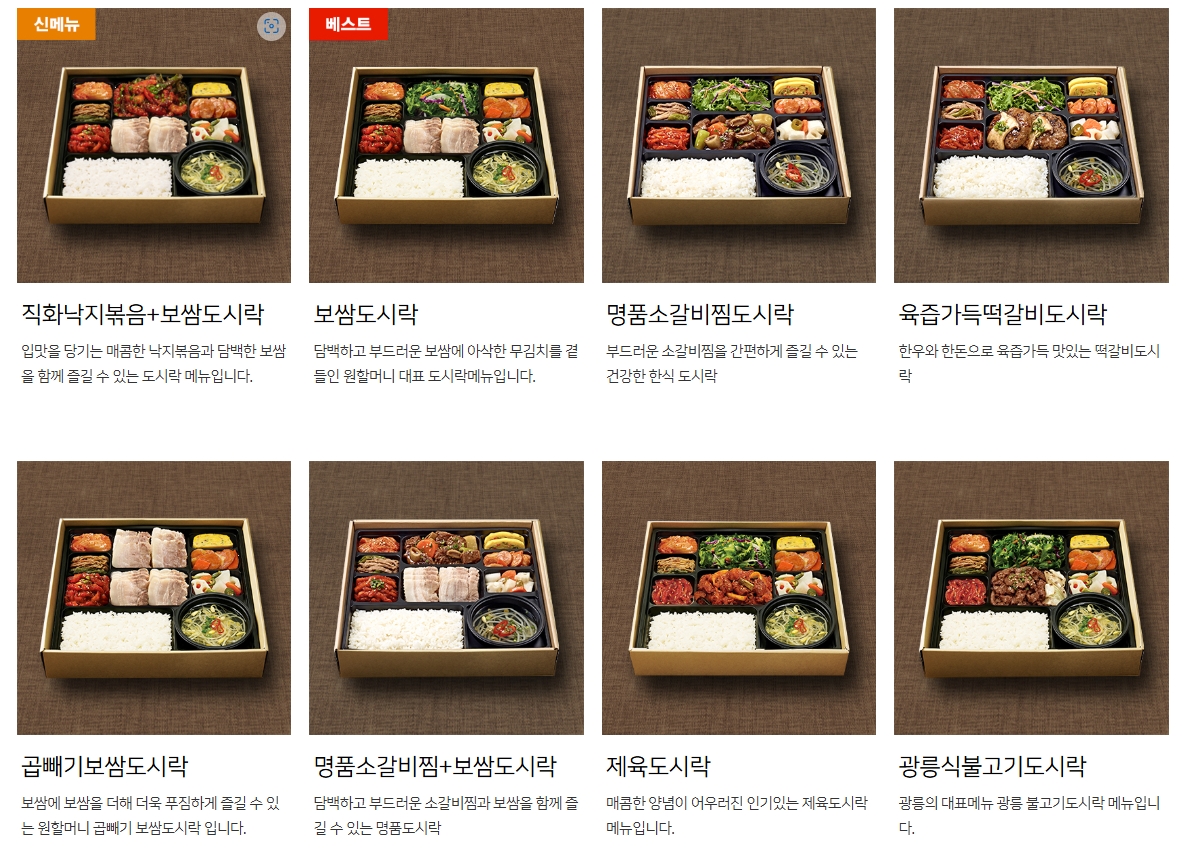 원할머니보쌈 도시락은 여러 가지 메뉴가 있어 선택의 폭이 넓습니다. 기본적으로 보쌈도시락 외에도 소갈비짐, 직화낙지볶음, 덮밥류 등 다양한 메뉴가 준비되어 있어, 각자의 취향에 맞는 음식을 고를 수 있죠.