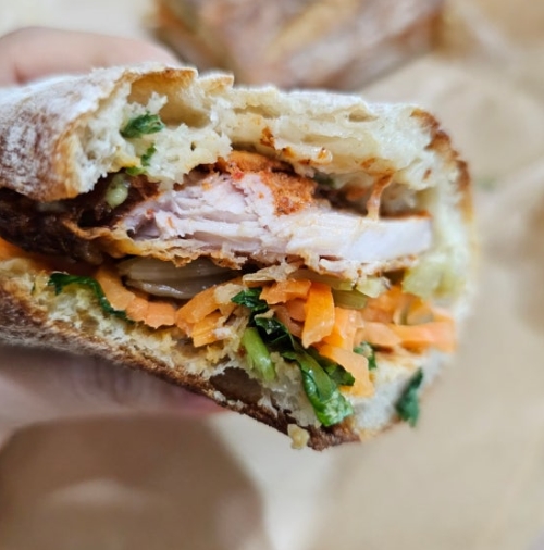타이 레드 커리 샌드위치는 태국풍 레드 커리 소스와 신선한 채소, 부드러운 치킨이 조화를 이루는 개성 강한 메뉴예요.