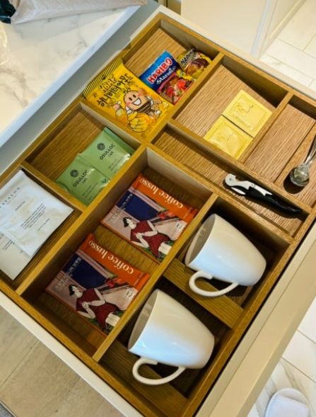 객실 내 미니바에는 다양한 음료와 스낵이 준비되어 있었고, 네스프레소 캡슐 머신도 있어 커피 한 잔과 함께 여유로운 시간을 보낼 수 있었습니다.