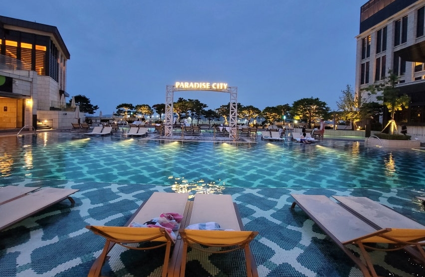 파라다이스시티 호텔의 수영장은 실내와 야외 두 곳으로 나뉘어 있습니다. 실내 수영장은 따뜻한 온도로 유지되어 있어 사계절 내내 이용할 수 있으며, 넓고 깨끗한 시설이 인상적이었습니다.
