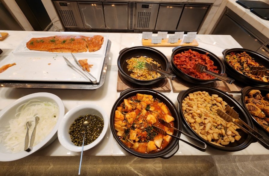 셰프가 즉석에서 만들어 주는 오믈렛이 부드럽고 맛있었고, 한식 코너에는 따뜻한 국과 반찬이 마련되어 든든한 한 끼를 즐길 수 있었습니다.