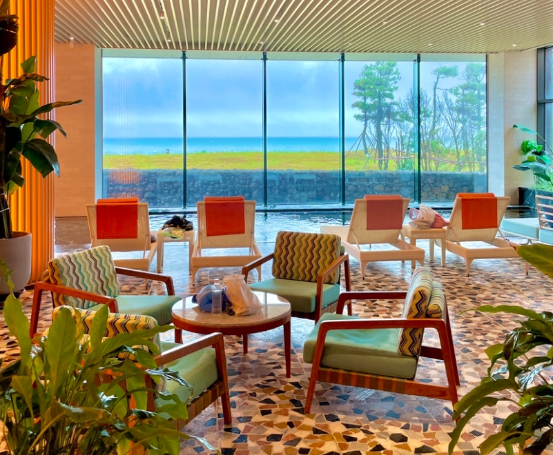 로비에 들어서면 높은 천장과 널찍한 공간이 먼저 눈에 띕니다. 자연 채광이 가득 들어오는 창을 통해 푸른 바다가 한눈에 들어오며, 고급스러운 인테리어와 차분한 색감이 조화를 이루고 있습니다.