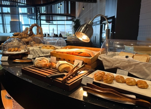 호텔 베이커리에서 갓 구운 크로와상과 바게트는 바삭하고 풍미가 뛰어나 커피와 환상적인 조합을 이뤘습니다.