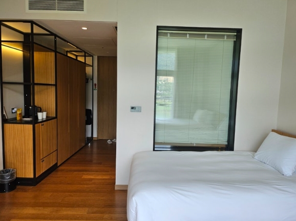 객실은 생각보다 넓진 않았지만, 적당한 크기와 깔끔한 인테리어 덕분에 매우 편안하게 느껴졌습니다. 다만, 아이와 함께 자는 데 있어 침대가 세미더블이라 약간 좁았던 점은 아쉬웠어요.