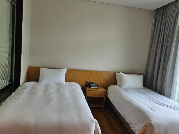 저희가 예약한 객실은 디럭스 트윈으로, 싱글 침대 1개와 세미더블 침대 1개가 있는 구조였어요. 아이와 함께 숙박하기에 딱 좋은 크기였고, 특히 마루 바닥이라서 카펫보다 위생적이고 편안했어요.