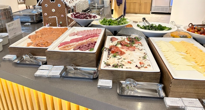 베이커리는 식빵, 바게트, 모닝빵, 애플파이 등 다양한 종류가 있었고, 샐러드, 두부구이, 함박스테이크, 연어 등도 제공되었어요.