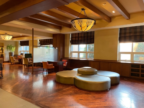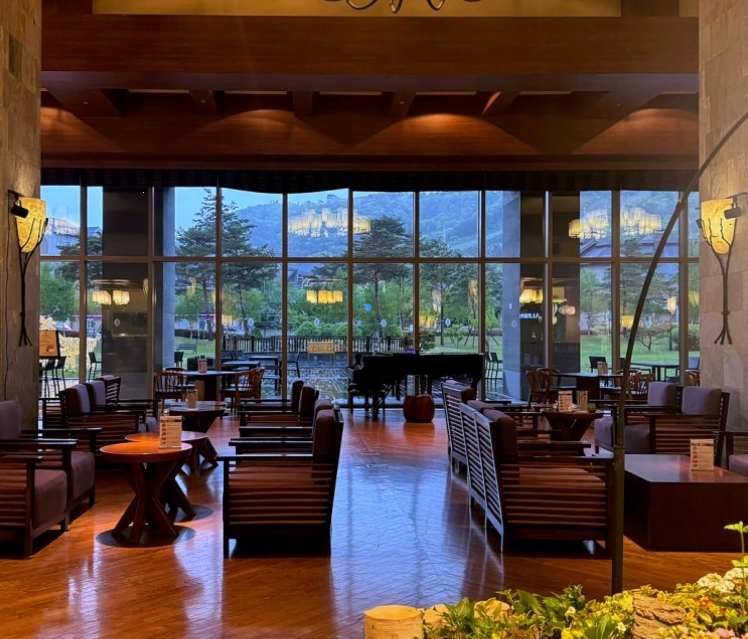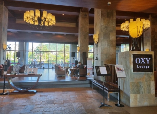 체크인 후 바로 들른 곳은 옥시라운지입니다. 이곳은 호텔의 1층에 위치해 있으며, 탁 트인 창문을 통해 리조트의 아름다운 자연을 한눈에 볼 수 있는 장소입니다.